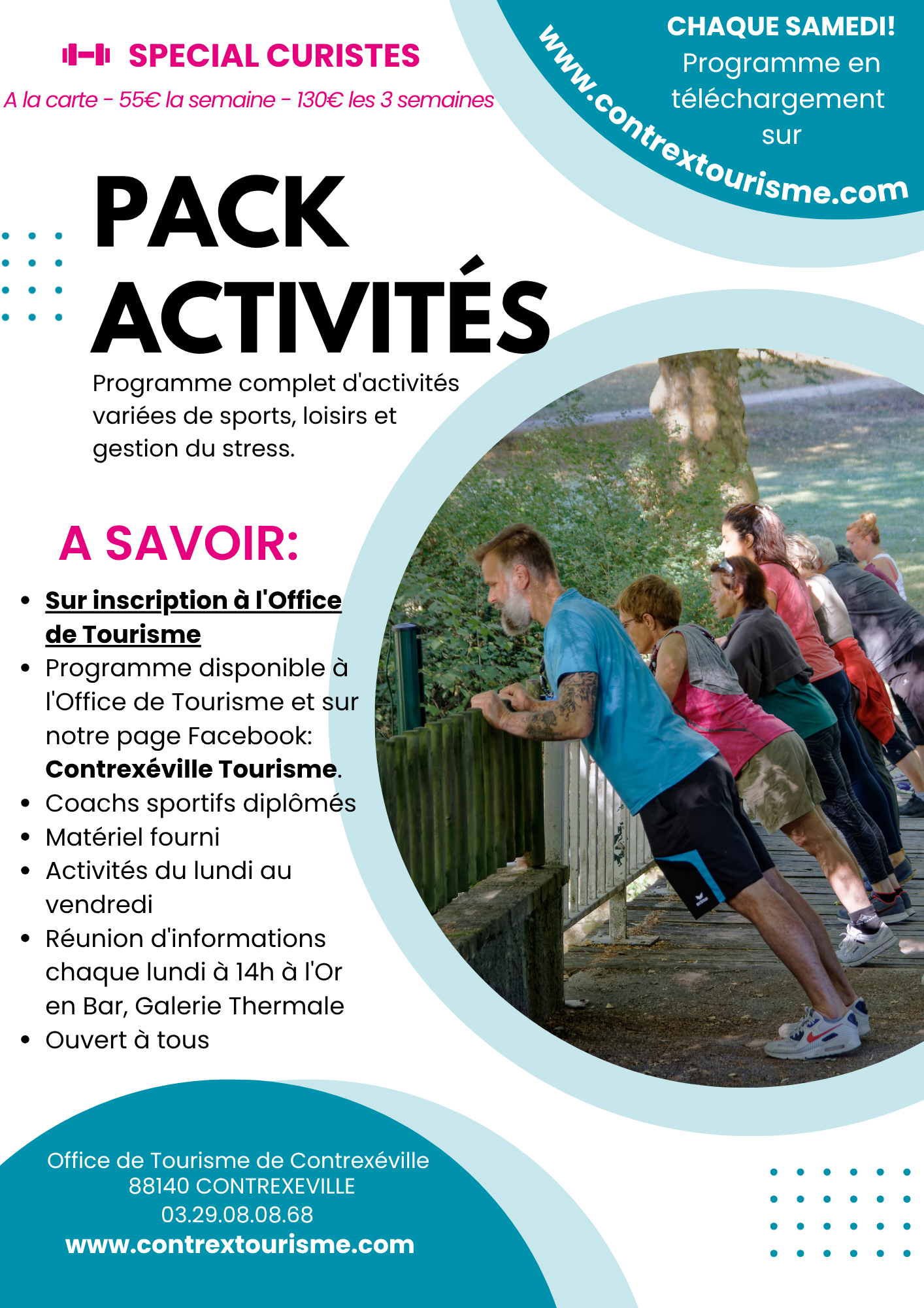 Que vous soyez curiste, touriste, ou même habitant de Contrexéville et ses alentours, vous pouvez accéder aux activités de sports, loisirs et gestion du stress proposées chaque semaine dans le programme de l’Office de Tourisme.