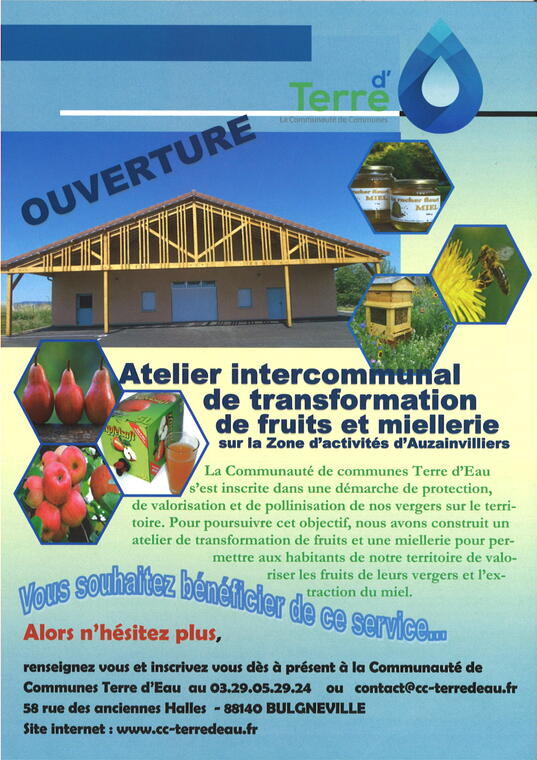 La communauté de communes a fait...Le Communauté de Communes Terre d'Eau s'est inscrite dans une démarche de protection de valorisation et de pollinisation de nos vergers sur le territoire. Pour poursuivre cet objectif, nous avons construit un atelier de transformation de fruits et une miellerie pour permettre aux habitants de notre territoire de valoriser les fruits de leurs vergers et l'extraction de miel.